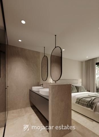 Boven biedt de eerste verdieping een meer privé verblijfsruimte, met nog drie dubbele slaapkamers. Eén slaapkamer heeft een eigen badkamer, terwijl de overige twee een familiebadkamer delen. Elke slaapkamer heeft directe toegang tot een eigen privéterras. De verhoogde ligging biedt een open uitzicht over de bekroonde Indiana golfbaan en richting de omliggende Almanzora-bergketens.